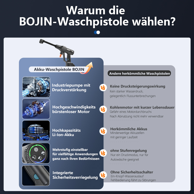 BOJIN kabelloser Hochdruckreiniger, 2,2 MPa, bürstenloser Motor, ausgestattet mit 6-in-1-Düse, 2 × 4,5Ah Akkus und 16,4 Fuß knickfestem Schlauch.